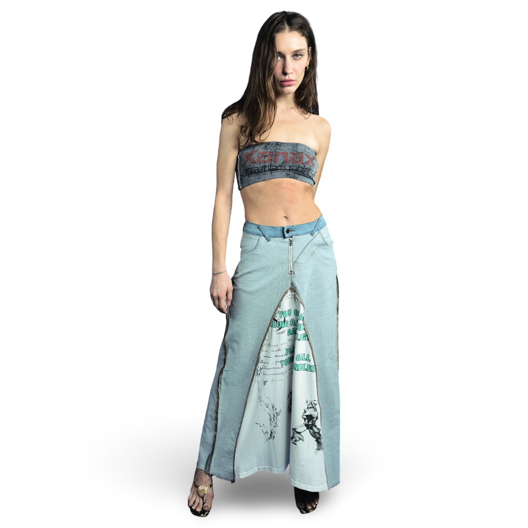 Cut from 100% cotton stone-washed denim, the exterior is intentionally distressed and hand oil-painted, creating irregular staining and tonal depth that cannot be replicated. The reverse construction exposes an interior graphic panel taken from the Take One Longsleeve, implemented as a back insert and allowed to remain visible through the split front.